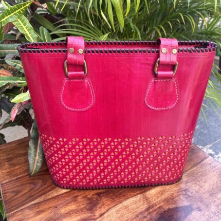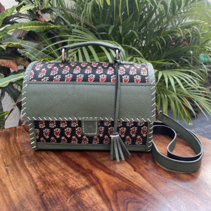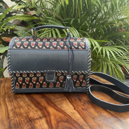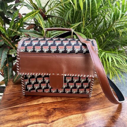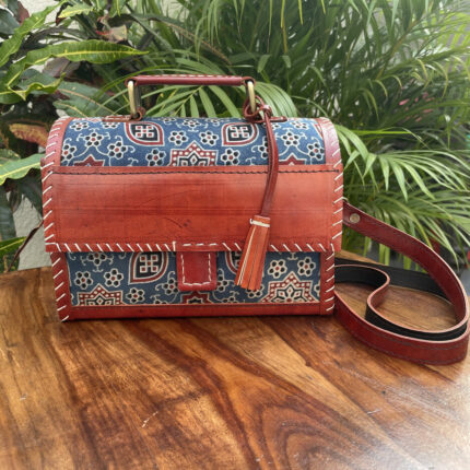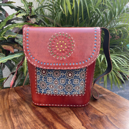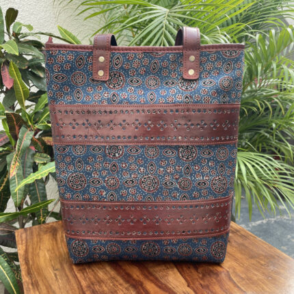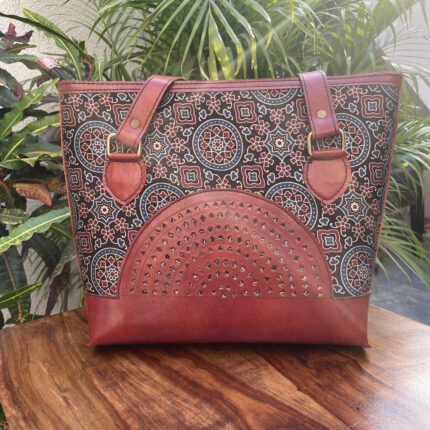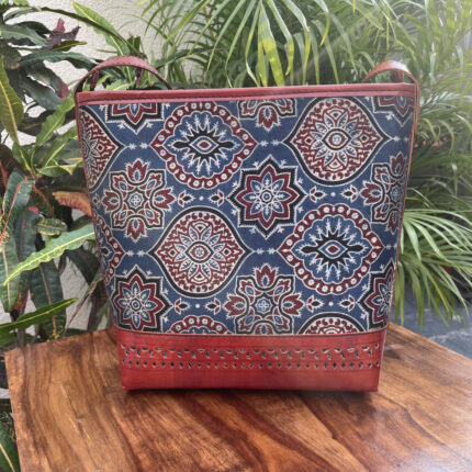 Leather Tote Bag with Ajrakh Print